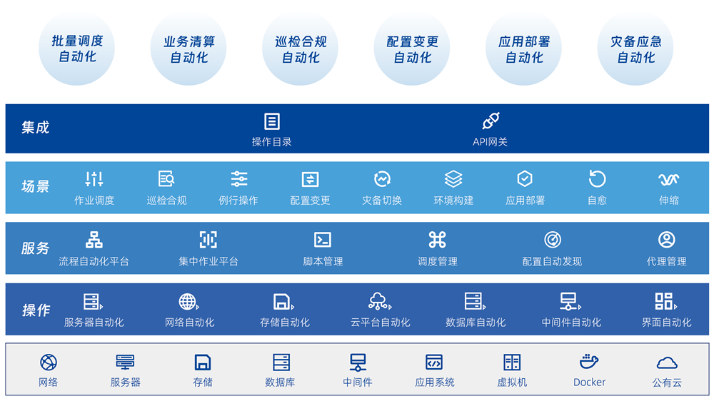提供组织级全流程自动化运维,可以把企业最佳的运维流程固化为模板,实现对任意数量 IT 资源的批量标准化执行,完成配置变更、数据收集、环境构建、故障自愈、资源调整、应用部署、自动巡检等场景的自动化,显著提升日常运维工作的效率和可靠性,缩短操作时间、降低运维操作的成本和操作风险。